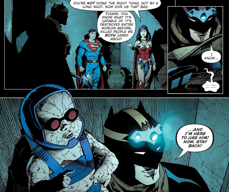 Mediante varios trucos — Dick Grayson amenaza la integridad del pantano forzando a que Swamp Thing luche con la Liga, por ejemplo— Batman gana tiempo, pero Superman es demasiado poderoso para ser engañado y captura al verdadero Batman. Clark le dice que han sido amigos por mucho tiempo e incluso reconoce el latir de su corazón; pero momentos después, Superman atraviesa el pecho de Bruce de un golpe y retira un dispositivo que, precisamente, reproducía el latir del bati-corazón: Superman había sido engañado y a quien había capturado no era otro más que Clayface. No obstante, en ese momento Diana y Clark supieron al lugar que se dirigía el verdadero Bruce.