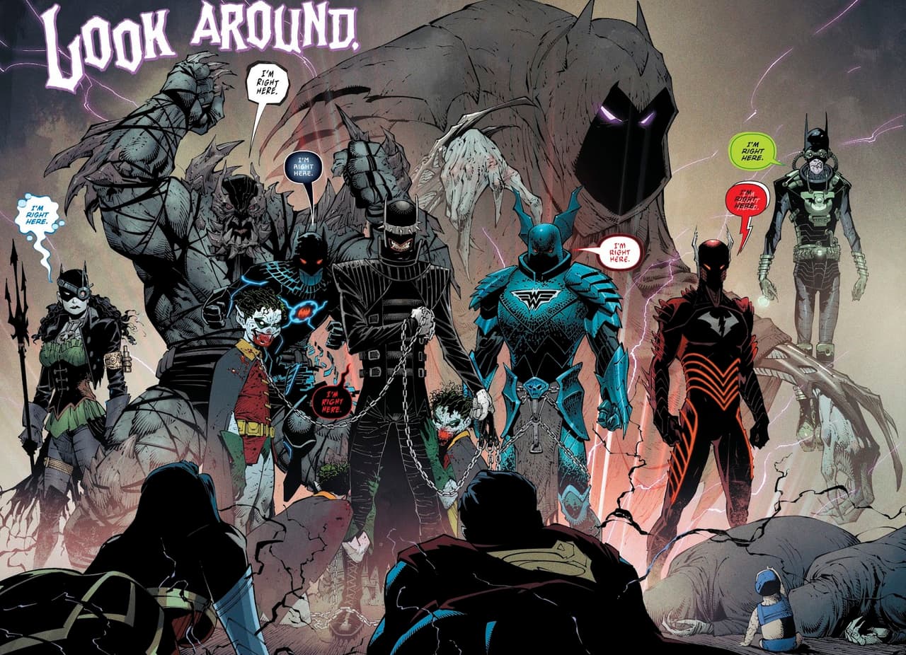 Sin embargo, Batman había caído en una trampa y se encontraba parado justo en el lugar que sus captores querían que estuviese. Y utilizando el Batmanium, metal restante para completar la puerta hacia el Dark Multiverse, Batman es absorbido por la oscuridad y la puerta es abierta. De ella salen tres Robin que devoran a los captores de Batman, e inmediatamente después se escucha la voz de las siete entidades oscuras: «La Muerte Roja», híbrido con Flash; «La Máquina de Asesinato», híbrido con Cyborg; « El 'quiebra-amaneceres'», híbrido con Green Lantern; « El Ahogado», híbrido con Aquaman; « El Despiadado», híbrido con Wonder Woman; « El Devastador», híbrido con Doomsday; y, por supuesto, « El Batman que ríe», híbrido con Joker. Todos asegurando ser Bruce Wayne en persona.