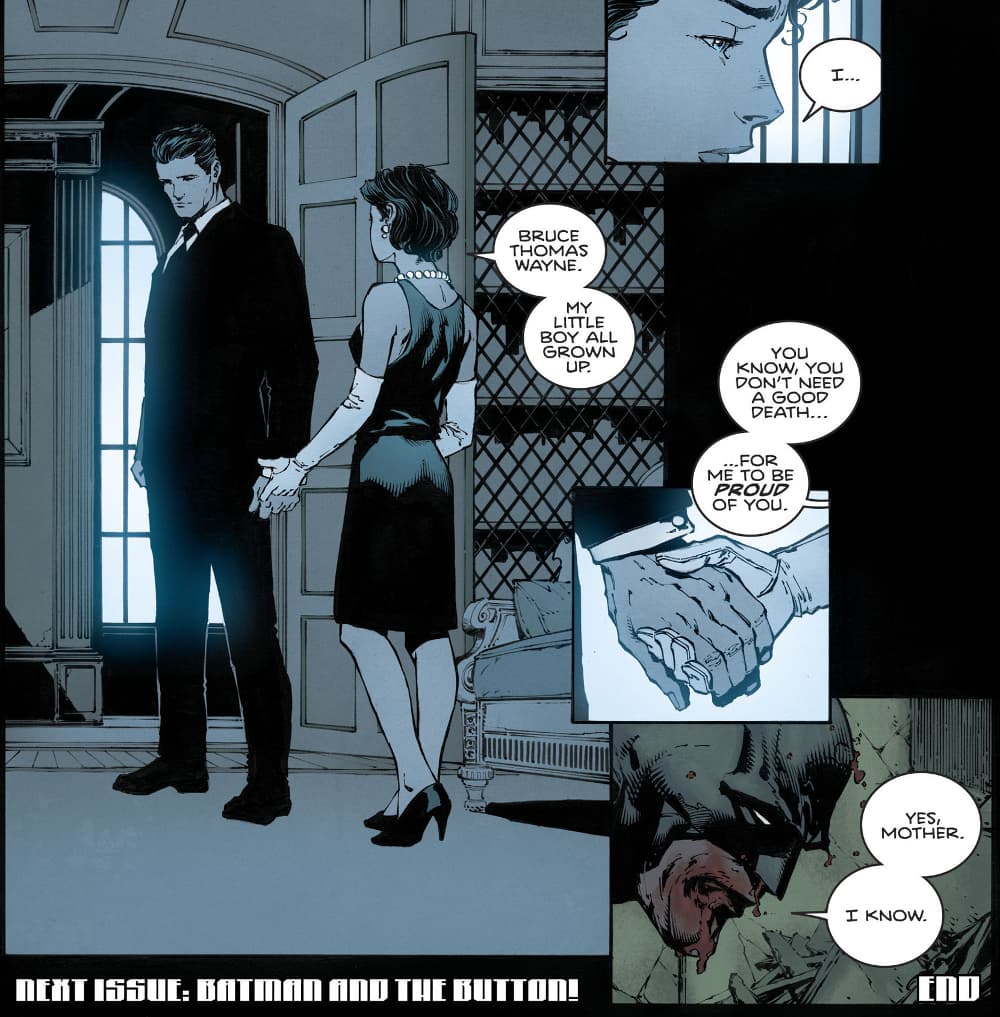 Al finalizar el issue, King comparte con nosotros la visión mental mantenida por un destrozado Batman. Bruce abandona su casa para cumplir con su deber dejando atrás a su madre, quien le dice: