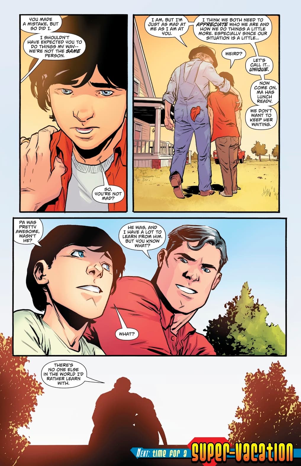 Clark —no Superman, Clark Kent— se refugia en su esposa, y gracias a su apoyo recuerda aquellos viejos relatos de su infancia en la granja Kent, cuando él también quiso hacer las cosas a su modo, cuando aprendió que la humildad es el poder más efectivo —incluso para un kryptoniano—. A través de este recurso, Superman #26 conecta tres generaciones en apenas 3 páginas, y, de paso, de manera casi imperceptible, enaltece valores perdidos y subestimados, olvidados entre tanta explosión: la familia, por ejemplo.