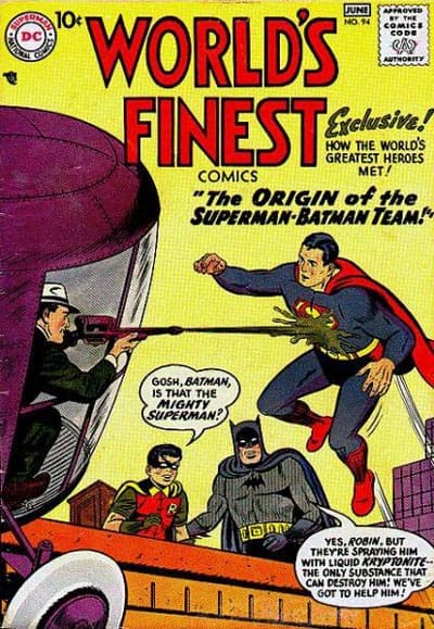 Después del primer encuentro oficial que ocurrió en la Era de Oro de los cómics, llegaría uno de la Era de Plata para sustituirlo. Todo ocurrió en las páginas de World’s Finest #94 (junio, 1958) de Edmond Hamilton y Dick Sprang, donde a través de un flashback vemos una aventura que tiene a Superman atrapado por una arma que dispara kryptonita líquida y el dúo dinámico queda a cargo de salvarle la vida. Las razones por las cuales se reemplazó este primer encuentro por el anterior escrito tan solo 6 años antes son al día de hoy un misterio.