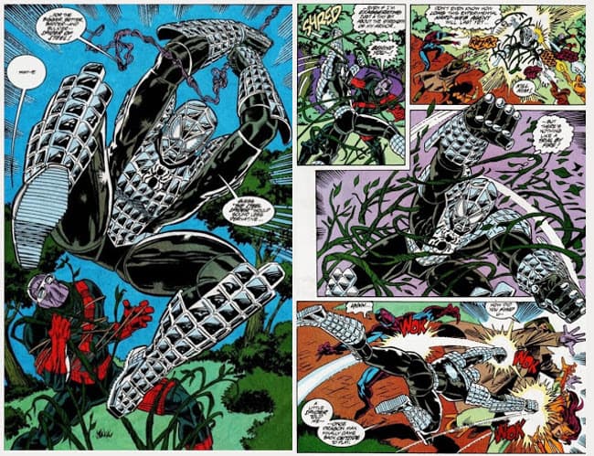Siendo el amigable vecino que es, Spider-Man no pudo dejar que Blood Rose, a pesar de su maldad, sea capturado por un grupo de villanos y asesinado. Por lo tanto salió en su defensa y se encontró con que los New Enforcers eran demasiados para él. ¿Cómo lo solucionó Spidey? Con otro de los grandes debuts olvidados de las páginas de Web of Spider-Man #100, la armadura de telaraña. Peter encontró una forma de hacer que su web sea dura como las placas de una armadura y confeccionó una suerte de nuevo traje que le permitiera combatir tantos villanos a la vez.