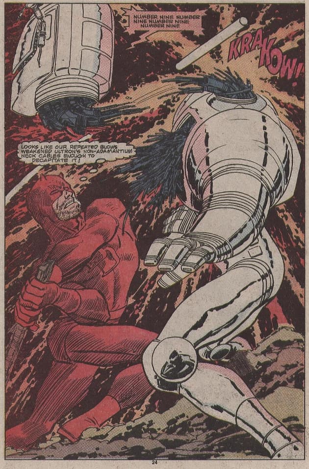 Ultron logra capturar a Número 9, pero su sistema empieza a fallar, atacándose a sí mismo y dejando al desnudo el cableado de su cuello. Advertido por Karnak, Daredevil toma nota de este punto frágil y arremete contra la bestia mecánica haciendo uso de... un palo.