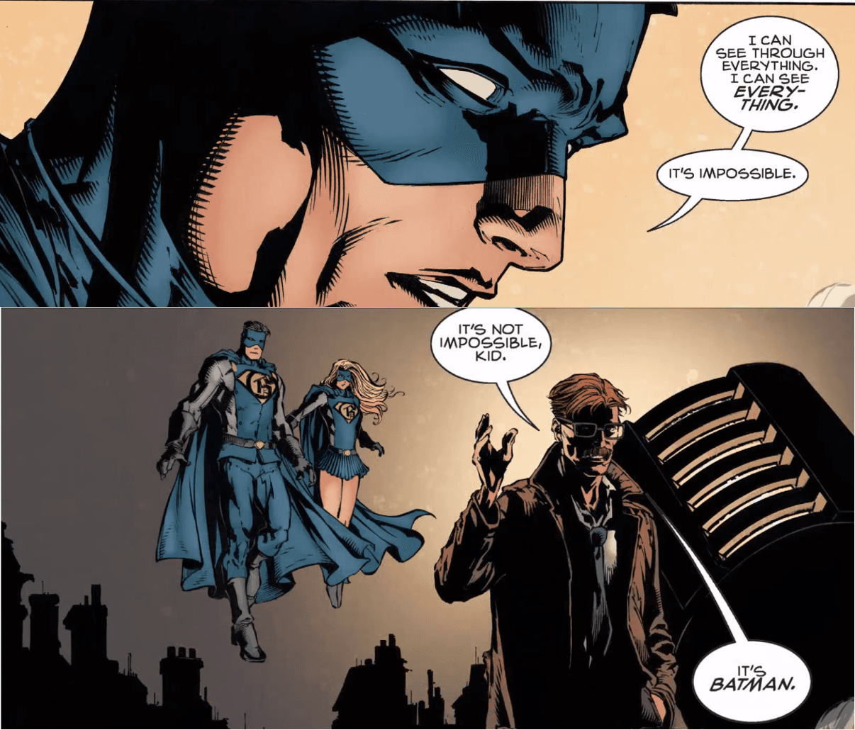 Aun así Batman enfrenta sus problemas de confianza y lleva a Gotham y Gotham Girl a una reunión en el tejado del departamento de policía de la ciudad, donde Gordon les informa de los acontecimientos que se dieron en su oficina. Cuando el caballero oscuro realiza su típica retirada silenciosa, los nuevos héroes se hallan sorprendidos por sus habilidades. Como Gotham dice: “ ¿Dónde está? Puedo ver a través de todo, puedo ver todo. Es imposible.” Gordon responde: “ No es imposible, chico. Es Batman”. La lección para los nuevos héroes es que más allá de sus nombres, Batman seguirá siempre siendo más Gotham que ellos o cualquier persona. El caballero oscuro y su ciudad es la más inquebrantable de las yuxtaposiciones.