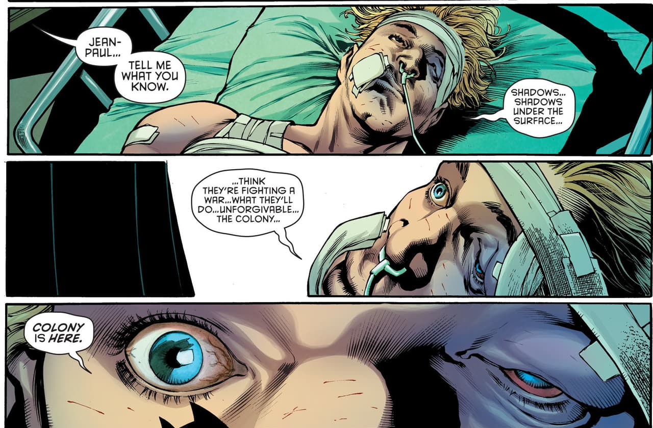 James Tynion hace una pausa del entrenamiento y la acción para desarrollar los demás pilares de la trama. Red Robin acude a Batman (nuevamente saltando la cadena de comando) y el caballero oscuro lo lleva hasta la improvisada clínica secreta donde Azrael se encuentra agonizando. En un balbuceo el ex asesino habla sobre un ejército y nombra a The Colony, o Colony, seguramente la amenaza que Batman está esperando que caiga sobre Gotham.
