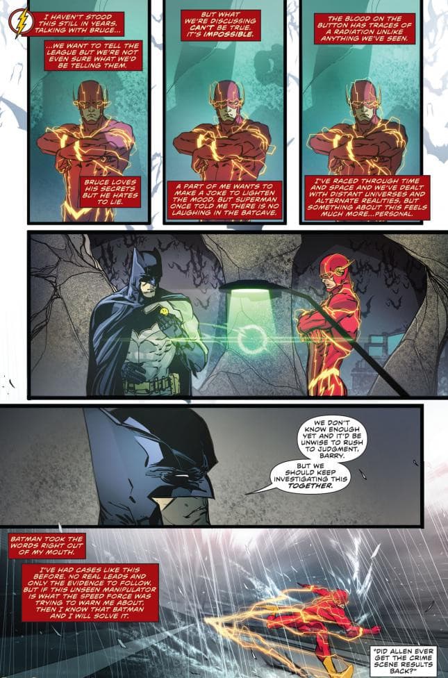 En la batcave, Bruce le cuenta a Barry sobre su visión de Wally (otro de los hechos que ocurrió en DC Universe: Rebirth #1) y de la aparición de un botón con una sonrisa y una mancha de sangre. Batman llegó a pensar en un momento que se trataba de una pista dejada por Joker pero hacia el final de la conversación comprenden que hay una conexión entre la advertencia de Wally sobre un enemigo vigilante y la aparición del botón. Flash y el caballero oscuro permanecen conversando seriamente al respecto mientras Williamson se despacha con la mejor frase del book, salida directamente del monólogo interno de Barry: “ A part of me wants to make a joke to lighten the mood, but Superman once toll me there is no laughing in the batcave”, que puede traducirse a: “ Una parte de mí quiere hacer un chiste para alivianar los ánimos, pero como Superman me dijo una vez, no existen las risas en la batcave”.