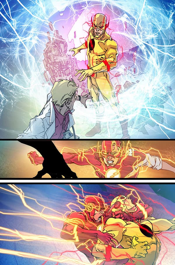 Ningún villano de la galería de Flash es presentado en este book, excepto Professor Zoom que hace acto de presencia en una visión/ fl ashback que sufre Barry, aunque la aparición de Zoom parecería más bien una herramienta del guionista para hacer transición hacia un monólogo sobre el pasado. Si bien todo indica que los números de Flash: Rebirth tendrán una importante conexión con los de DC Universe: Rebirth, es obvio que en algún momento volveremos al crimen de las primeras páginas, el otro storyline que el escritor empieza a desarrollar. Una madre asesinada, una confesión de culpabilidad por parte de su marido y un niño que presenció la escena y ahora queda solo, abandonado. Un caso que se asemeja demasiado a eventos que también le ocurrieron a Barry Allen como para no tener algo que ver.