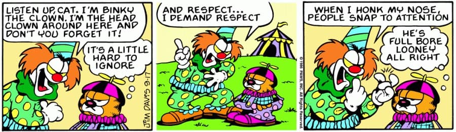 Cuando Garfield decide escapar con un circo es enviado con este payaso malhumorado. En la serie animada tendría su propio programa televisivo.