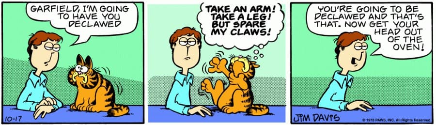 Ocurrió cuando Jon le dijo que lo piensa someter a una desungulación (operación donde se corta la última falange para que no crezcan más las uñas). Tras la siguiente tira, Davis recibió críticas por bromear sobre el suicidio, así que no volvió a realizar un chiste así.