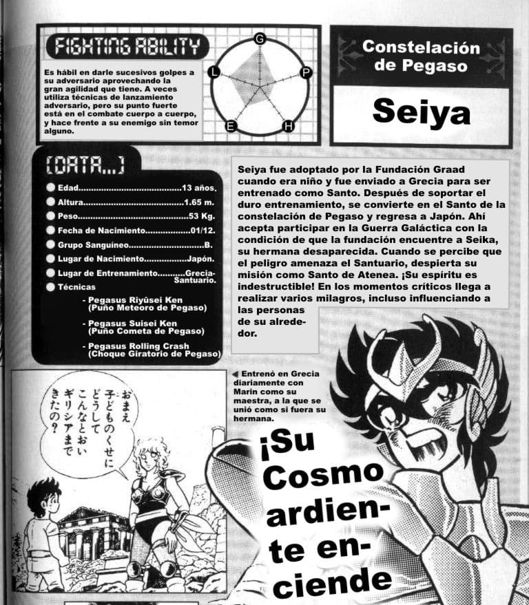 El protagonista de la historia y Santo de la leyenda. En cifras frías, posee el nivel de pelea (agilidad, fuerza de puño y patada) más elevado de los Santos, lo cual queda evidenciado a través de su estilo de lucha arriesgado, vehemente e imprudente. A pesar de todas sus hazañas, su potencial no es el más sorprendente...