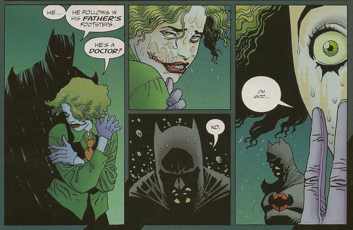 En esta línea temporal, aquella fatídica noche en el callejón no murieron los padres de Batman, sino que fue el joven Bruce Wayne el que recibió el disparo, provocando que su padre, Thomas Wayne, se pusiera el manto del murciélago y su madre, Martha, cayera en la locura y se convirtiera en el terror de Gotham: el Joker.