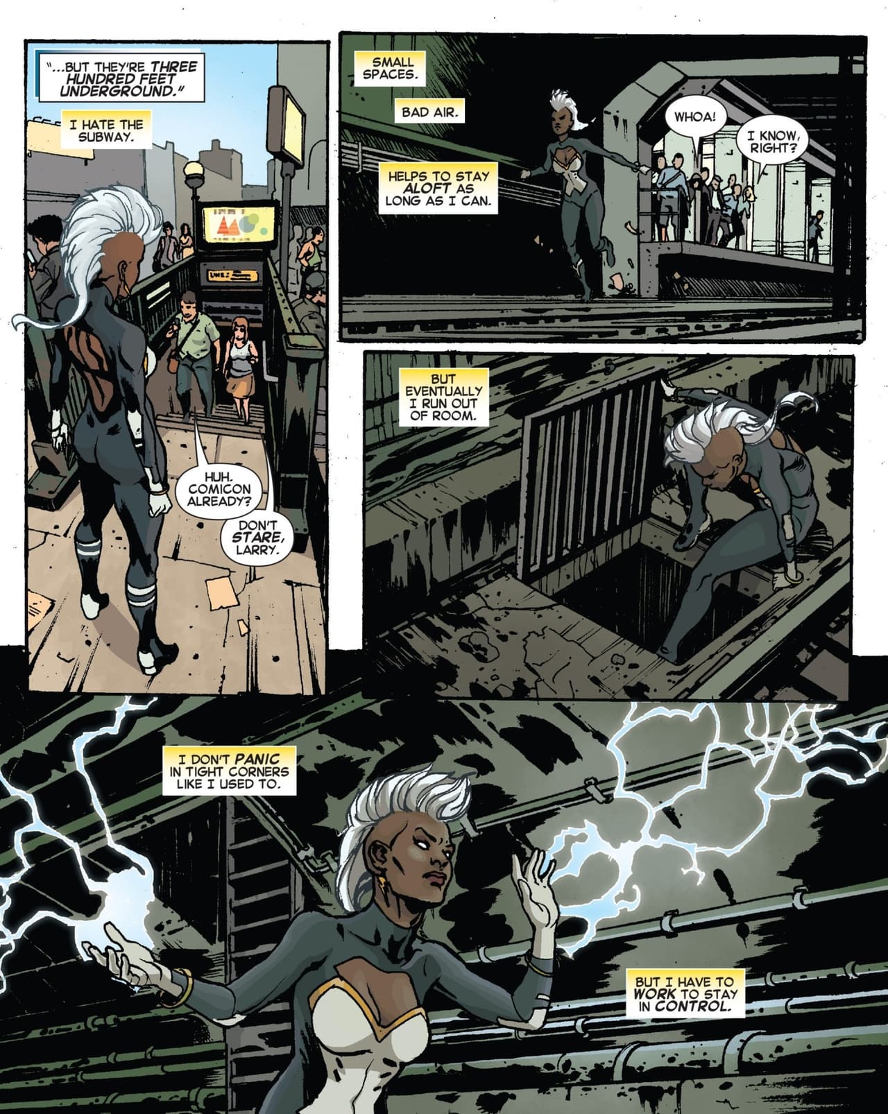 Storm no sólo odia estos espacios, la paralizan por completo al grado de que no puede usar sus poderes para controlar el ambiente. Aunque en más recientes versiones de X-Men se muestra a una Ororo más estable en espacios pequeños.