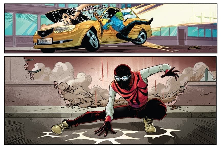 Gracias al evento Spider-Man Annual #1 ahora podemos conocer el primer traje de Miles, el que utilizó para testear sus poderes cuando los adquirió y tuvo que enfrentarse a un guerrero Skrull infiltrado.