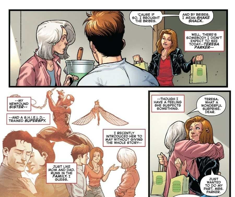 Sin embargo, en otra aventura de Teresa con Spider-Man lograron encontrar una de las casas que los Parker usaban como bases de operaciones, y ahí confirmaron el nacimiento secreto de la chica y que oficialmente eran hermanos.