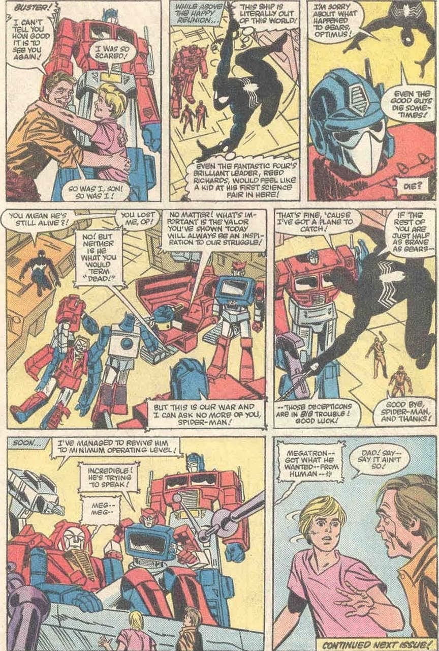 Afortunadamente, Gears es reparado por el resto de los autobots y vuelve a estar en funcionamiento, dejando a Spidey un poco más tranquilo en el final de su extraña aventura con los transformers.