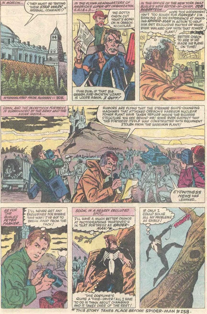 El cruce entre Spider-Man y los autobots se dio en Transformers #3 (1985) cuando autobots y decepticons invadieron la ciudad de Oregon. Aquí vemos la aparición de S.H.I.E.L.D., que manda agentes a neutralizar la situación, y a Peter Parker que es enviado como reportero para cubrir el enfrentamiento.