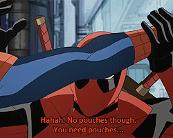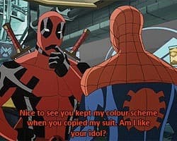 Deadpool: Es lindo ver que mantuviste el esquema de colores cuando COPIASTE mi traje. ¿Soy tu ídolo o algo así?, jajaja, no tienes bolsillo, necesitas bolsillos.