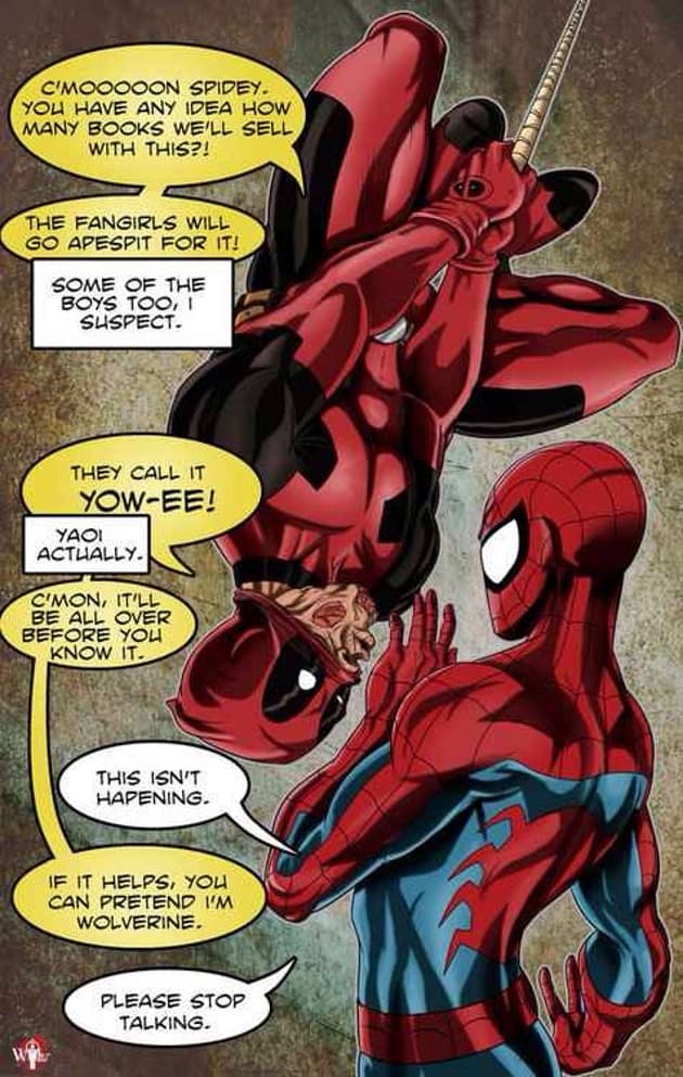 Deadpool: ¡Vamos spidey, tienes idea de cuántos cómics venderíamos con esto?, ¡terminará antes de que te des cuenta!
