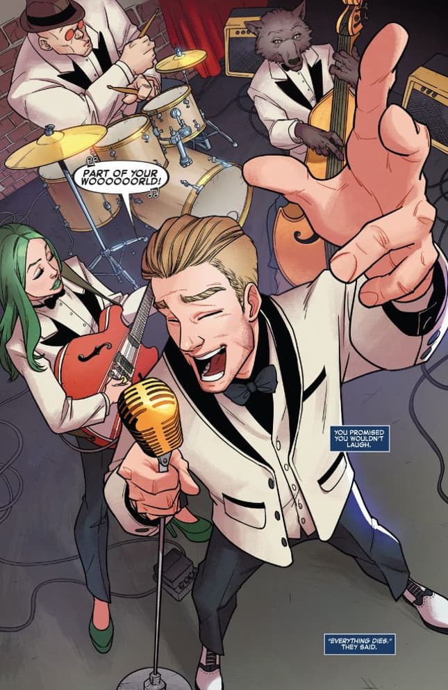 Secret Wars #1 que el universo explotó, Doom se convirtió en un dios y la mayoría de los héroes son inconscientes de la antigua realidad: así, Peter Quill se convirtió en cantante.