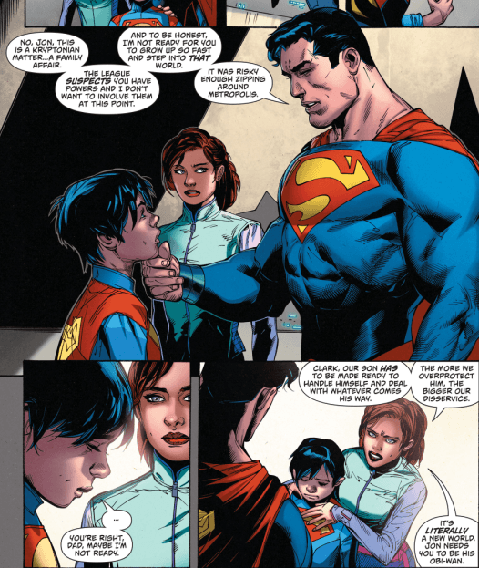 Luego de arribar en la Bat-Cave, Superman trata de explicarle a Jon que no debe exponerse demasiado; en respuesta a esto, Lois reprende a Clark por su actitud sobreprotectora alegando lo siguiente: