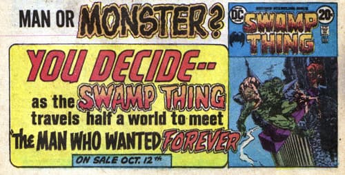 A mediados de los años 70s, Swamp Thing aparece por primera vez en una historia corta de la antología de terror House of Secrets. El personaje resultó tan curioso que DC Comics encomendó a Len Wein y Bernie Wrightson una serie centrada en el personaje. No duró demasiado, pero abrió las puertas para una nueva serie en 1982.