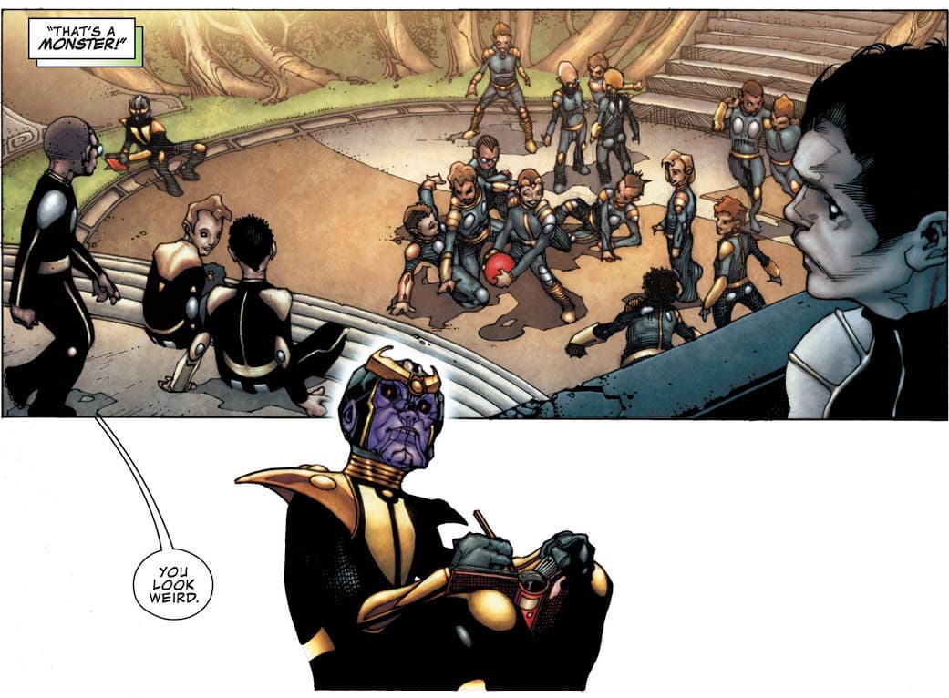 Su apariencia peculiar provocó que los demás niños lo despreciaran y lo llamaran monstruo, no lo querían ni cerca y debido a esto nunca tuvo amigos. Para pasar el tiempo, Thanos leía un libro tras otro, lo que le ayudó a conseguir un increíble intelecto.