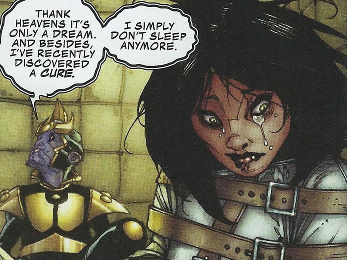 Durante las visitas a su madre en el manicomio, el "titán loco" le contaba a su madre sobre sus pesadillas, sin saber que fue ella misma quien lo intentó matar. La solución para acabar con los terribles sueños fue dejar de dormir para siempre.