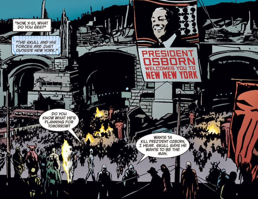 Norman Osborn también se convirtió en presidente en la distopía que nos presenta Earth X. Allí, el reciente presidente tiene que utilizar una máscara de humano ya que su rostro realmente se asemeja al de un duende verde, y llega al puesto de poder a través del control económico que ya tenía sobre el país. The Skull es quien eventualmente termina destituyendo el régimen y asesina al presidente arrojándolo por una ventana de la Casa Blanca. El cuello de Osborn se quiebra de una manera muy similar a la secuencia en la que asesinó a Gwen Stacy. Karma, señor presidente.