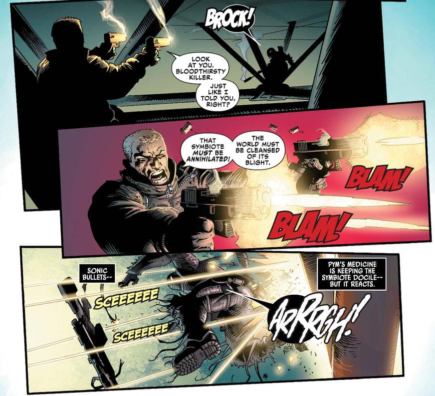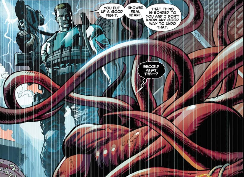 Brock persiguió al Agente Venom, pero descubrió un grupo criminal que cultivaba simbiontes para esclavizarlos, así que decidió eliminarlos a ellos y detener la búsqueda de Venom para dejarlo con vida.