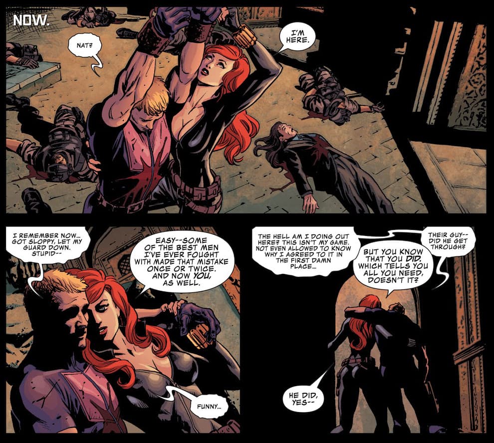 Durante Secret Avengers #1 (2013) vimos a Black Widow mostrando uno de sus rostros más auténticos: el de amiga. Y por si fuera poco, también vimos en acción su otra gran naturaleza: la de asesina. Una amiga/asesina que es demasiado buena en ambos planos. Natasha hizo nada menos que eliminar a todo un edificio de mercenarios y su líder, un traficante de armas llamado Andras Bertesy, para rescatar a su más querido amigo, Clint Barton, el viejo y querido Hawkeye.