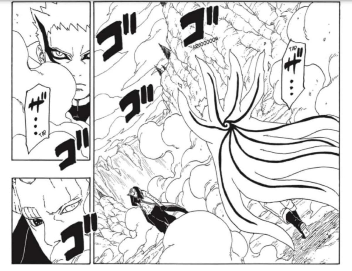 La pelea se reinicia, Isshiki ataca a Naruto, pero a diferencia de antes, con su nueva transformación el Hokage no solo le sigue el ritmo, sino que parece que supera al Otsutsuki.