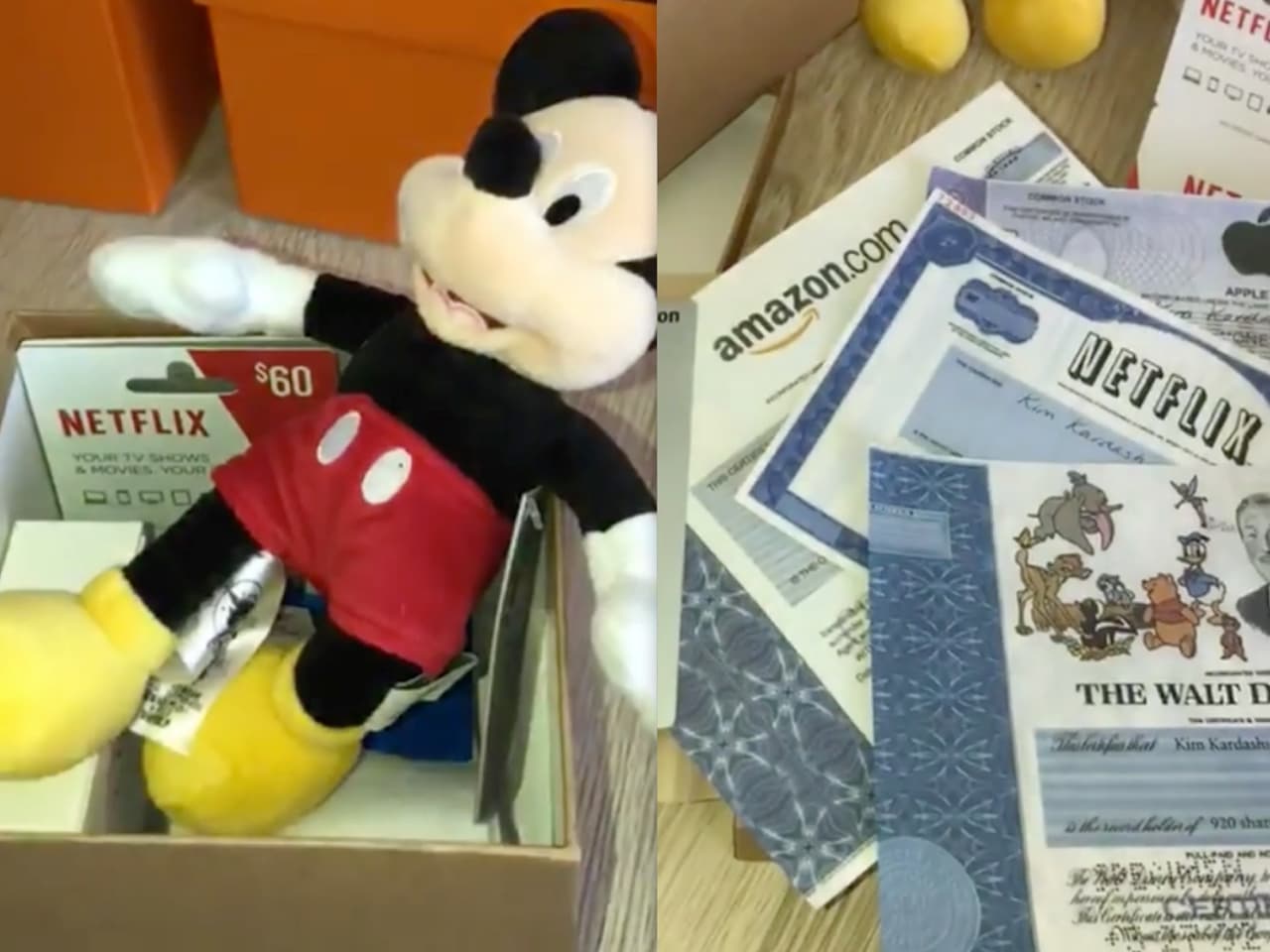 En el video, Kardashian muestra cuando abre la primera de dos cajas y saca un peluche de Mickey, unos audífonos inalámbricos de la compañía Apple, unas medias Adidas y varios certificados de regalo de las compañías Netflix y Amazon.
