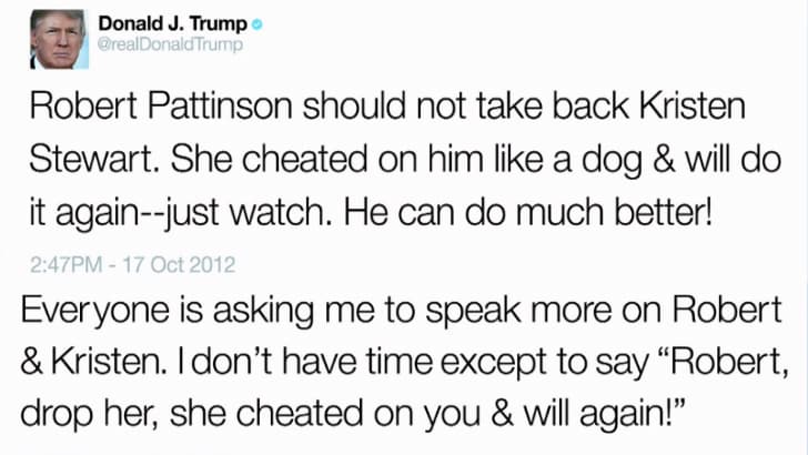 "Robert Pattinson no debe regresar con Kristen Stewart. Ella lo engañó como perro y lo volverá a hacer, sólo hay que esperar. El puede aspirar a una pareja mucho mejor", escribió el 17 de octubre de 2012 el mandatario republicano.