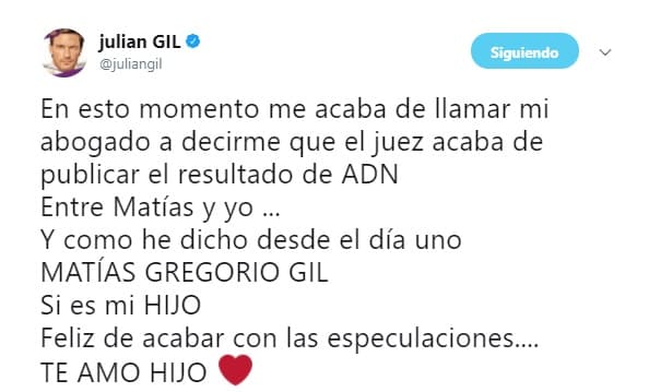Julián Gil anunció que los resultados de la prueba de ADN ya fueron entregados y confirmó lo que siempre había dicho, el pequeño Matías Gregorio Gil de Sousa es su hijo: “En este momento me acaba de llamar mi abogado a decirme que el juez acaba de publicar el resultado de ADN entre Matías y yo… y como lo he dicho desde el día uno Matías Gregorio Gil es mi hijo”.