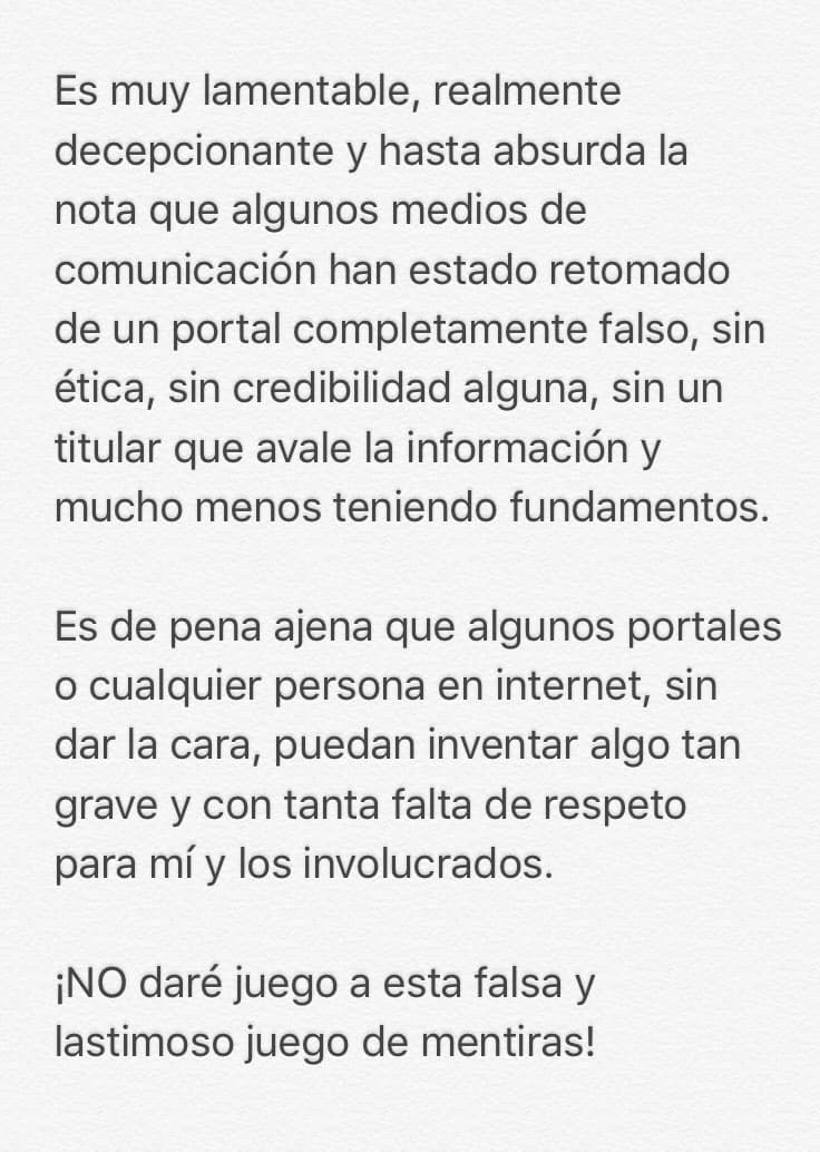 El enojo de la actriz no se hizo esperar, por lo que aprovechó sus redes sociales para explicarle a la prensa y al público en general que está cansada de este tipo de escándalos: “Es muy lamentable, realmente decepcionante y hasta absurda la nota que algunos medios de comunicación han estado retomando de un portal completamente falso, sin ética, sin credibilidad alguna, sin un titular que avale la información y mucho menos teniendo fundamentos”, comentó.