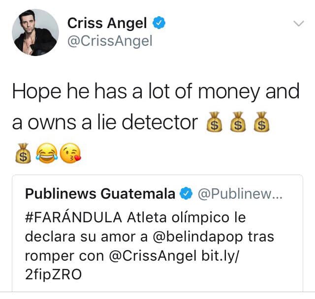 Esos mensajes afectuosos a Belinda contrastan con las palabras del ex de la cantante, el mago Criss Angel, quien a través de la red social le lanzó una fuerte advertencia a los pretendientes de la artista.