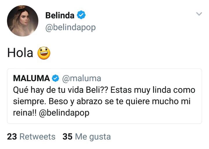 Este miércoles, Belinda contestó de inmediato en Twitter a Maluma, al que le envió un saludo.