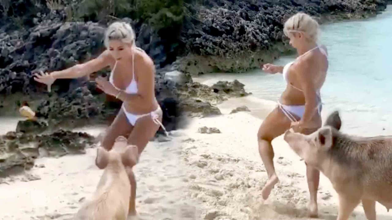“¡Me mordió la nalga!“: Michelle Lewin entra en pánico cuando un cerdo la embistió por la retaguardia en bikini