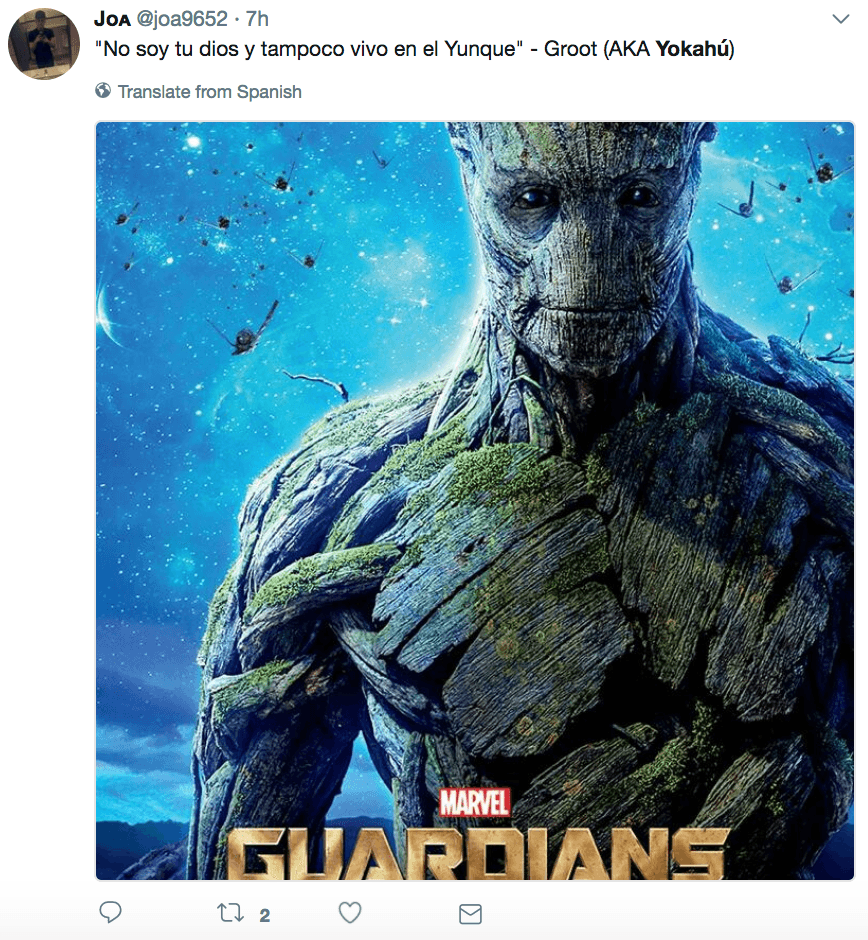Es por eso que en tiempos de huracán ha circulado en redes sociales esta imagen inspirada en Groot, personaje de Guardians of the Galaxy, sobre El Yunque, como si se tratara del mismísimo Yucaju o Yokahu, como lo llaman en Instagram.