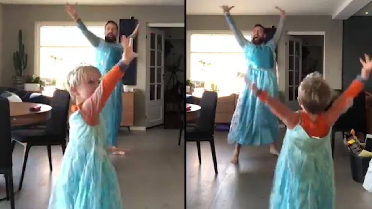 Un comediante noruego no dudó ni un momento en complacer a su hijo, que quería disfrazarse de Elsa, protagonista de la película 'Frozen'. Para ello compró dos vestidos de la princesa y juntos bailaron 'Let It Go' en la sala de su casa.