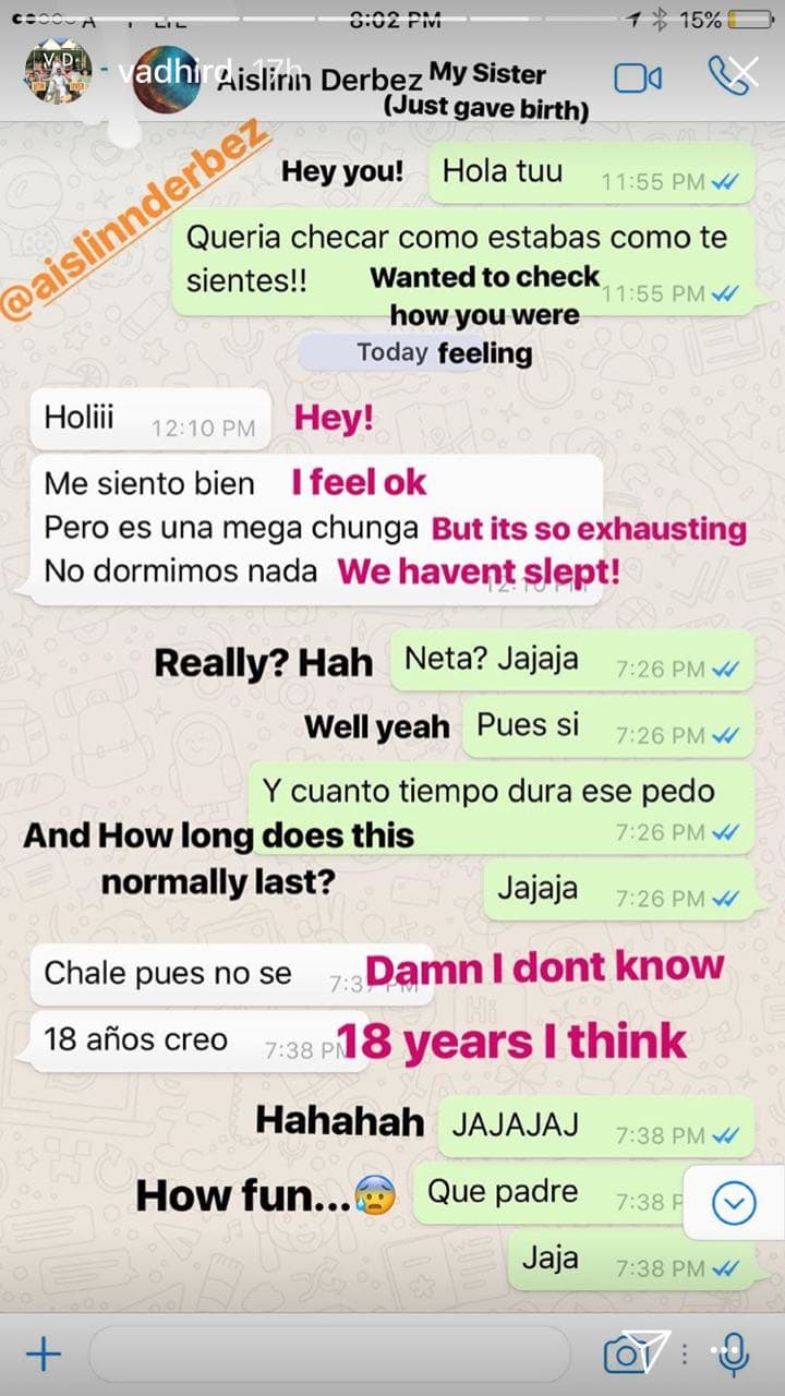 A través de los mensajes, Vadhir -con cierto tono de ironía- le pregunta a Aislinn hasta cuándo cree que pueda descansar. “Pues no sé, 18 años, creo”, fueron las palabras de la hija de Eugenio Derbez.