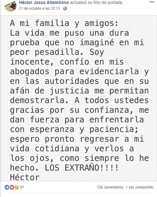 “La vida me puso una dura prueba que no imaginé (ni) en mi peor pesadilla. Soy inocente, confío en mis abogados para evidenciarlo y en las autoridades que en su afán de justicia me permitan demostrarla. A todos ustedes, gracias por su confianza, me dan fuerza para enfrentarla con esperanza y paciencia; espero pronto regresar y verlos a los ojos como siempre lo he hecho. ¡Los extraño! Héctor”, se lee en la imagen compartida a través de su cuenta personal de Facebook.