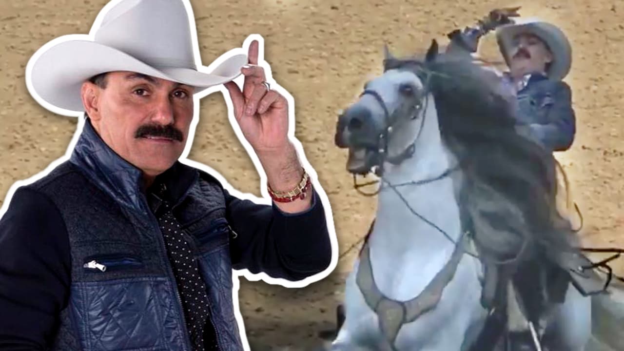 El cantante de regional mexicano cantaba montado a caballo durante su presentación en Rowell Ranch Rodeo, California, pero desafortunadamente sufrió una caída. Lo curioso fue que aún cuando los paramédicos lo atendían en el rodeo, él seguía cantando.
