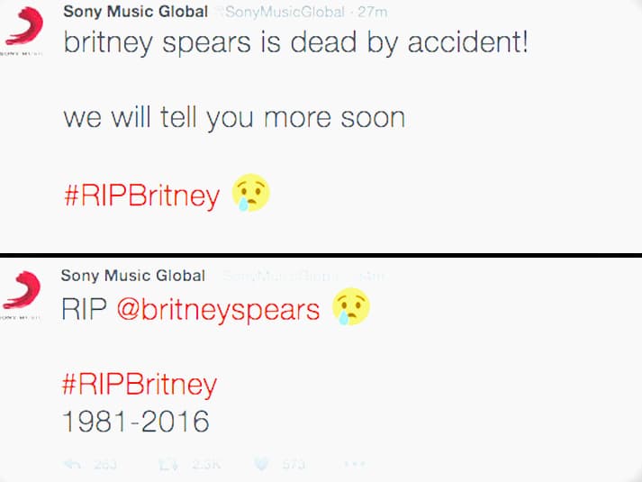 Aunque Sony Global borró los tuits enviados por los piratas, que con solo mirarlos sembraban dudas pues utilizaban signos de admiración al decir que Britney Spears había fallecido de forma accidental, copia de los mensajes quedaron en internet.