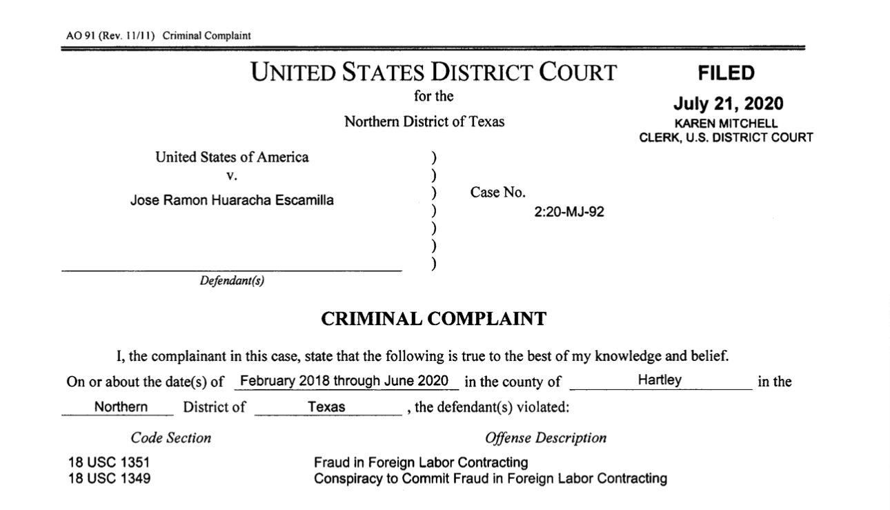 Ya en Dalhart, cada quincena durante meses Pablo dice que entregó en efectivo una parte de su cheque a este supervisor, José Ramón Huaracha. Otra parte se fue a México para mantener a su esposa e hijos; y en su comunidad, pagó una ‘cuota’ más de cientos de dólares a un delincuente para que no le hiciera daño a su familia.