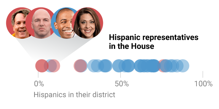 In the 116th Congress that begins in 2019, there are larger white population than hispanics in 20% of the districts with Latino representatives.
