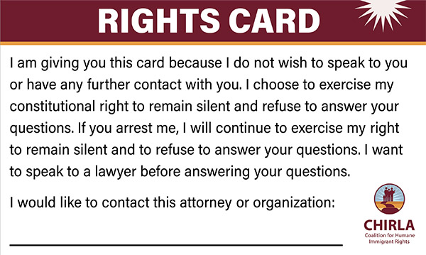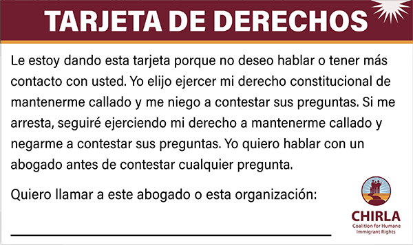 - Tienes derecho a permanecer en silencio y comunicarlo al agente que está realizando la detención. Lleva contigo una tarjeta con tus derechos, en inglés y en español, y muéstrala al oficial de ser necesario.