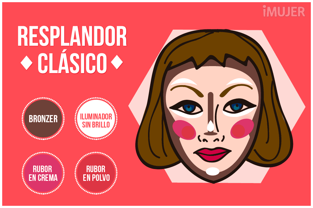 Si quieres darle a tu rostro un resplandor clásico, debes utilizar un bronzer en la línea del rostro, un iluminador sin brillo que le dará luz al rostro de manera natural y que debes aplicar debajo de los ojos, en nariz, mentón y arriba de las cejas.