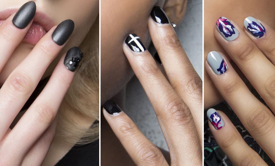 2. Negro intenso. Para darle un toque gótico a cualquier look lleva los tonos oscuros tanto en las uñas como en los labios. Los esmaltes negros y grises muy oscuros se presentan en acabado mate y brillante. Con estos tonos también puedes crear un efecto degradado. Y también se le puede añadir cristales negros o productos para crear relieve.