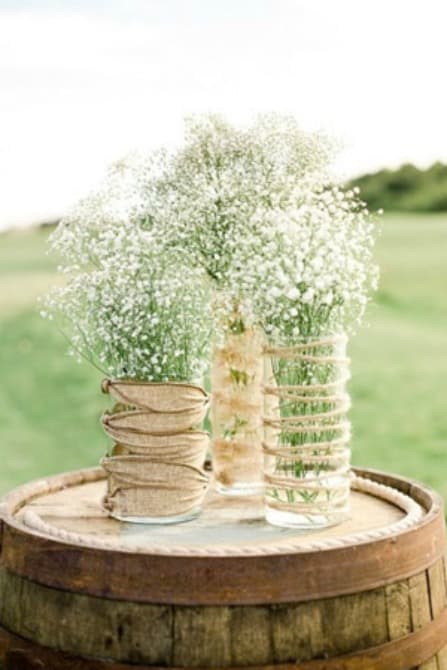 Decora jarrones de vidrio con piola para una decoración rústica.